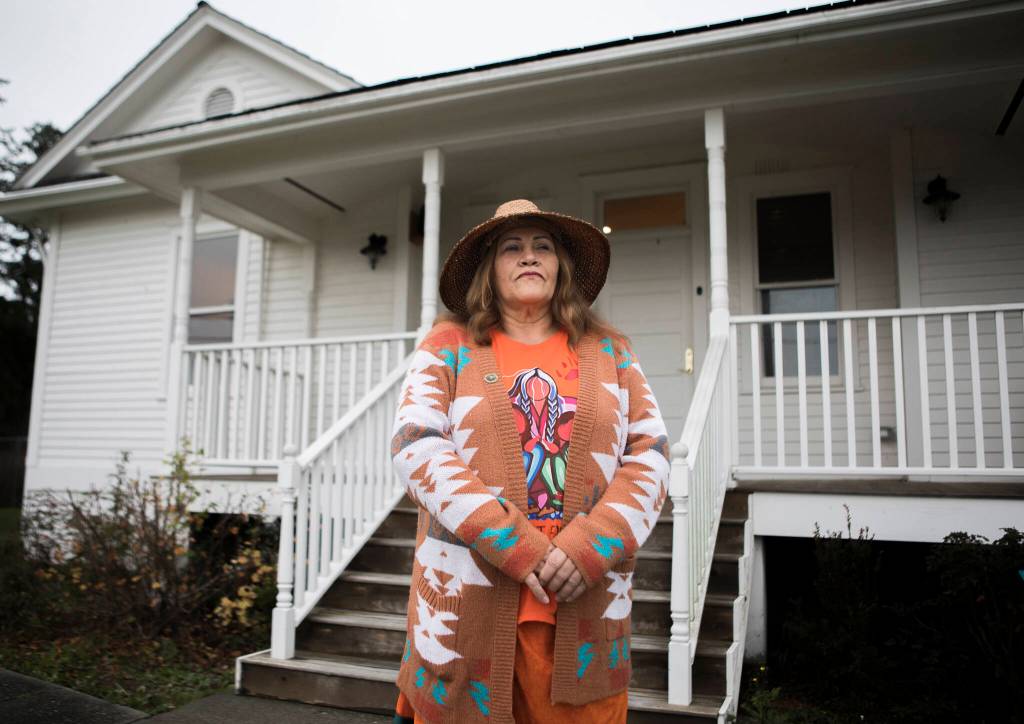 Tulalip Tribes Chairwoman Teri Gobin stands outside the former office building of the Tulalip Indian Agent on the Tulalip Reservation. (Olivia Vanni / The Herald)
