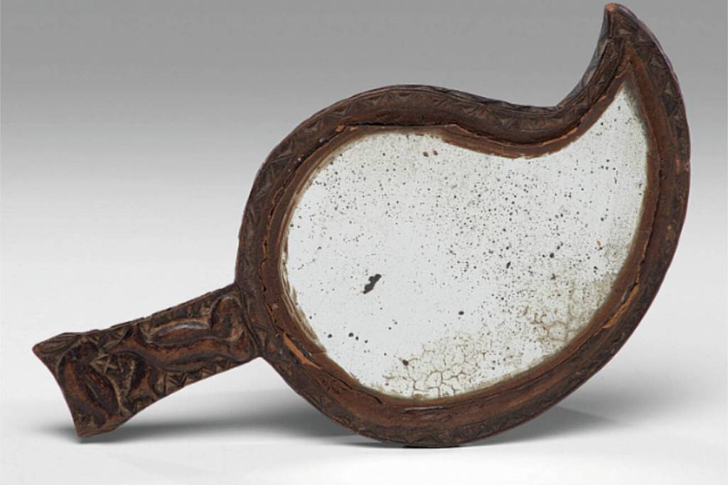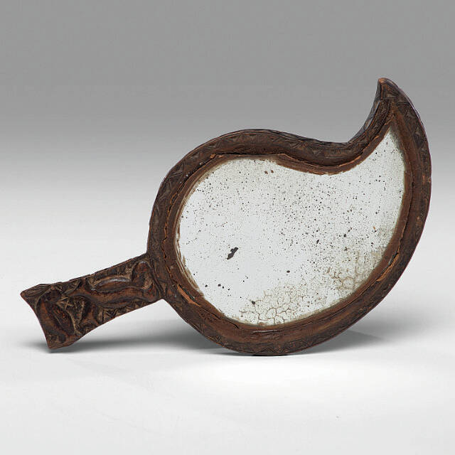 This leaf-shaped hand mirror in an irregular wooden frame is a “make-do” mirror, made by setting a broken mirror in a frame so it could still be used. It sold for $438 at Cowan’s Auctions. The shape of the mirror and the chip carving on its frame and handle show it was made with care — a piece of folk art as well as a utilitarian object.