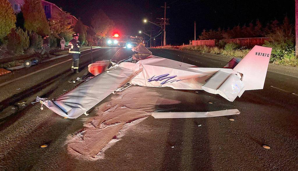 They were heading to Paine Field when the engine failed, hit high tension power lines and crashed on 228th Street SE near 42nd Avenue SE around 10:20 p.m., according to Snohomish Regional Fire and Rescue.