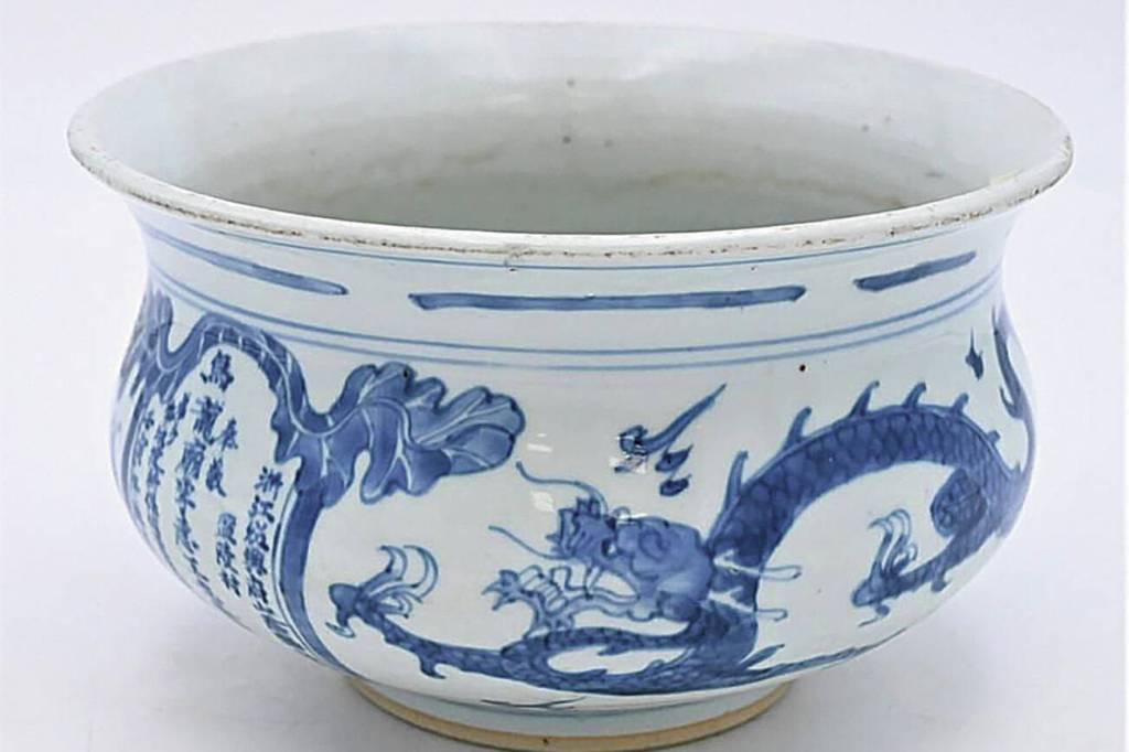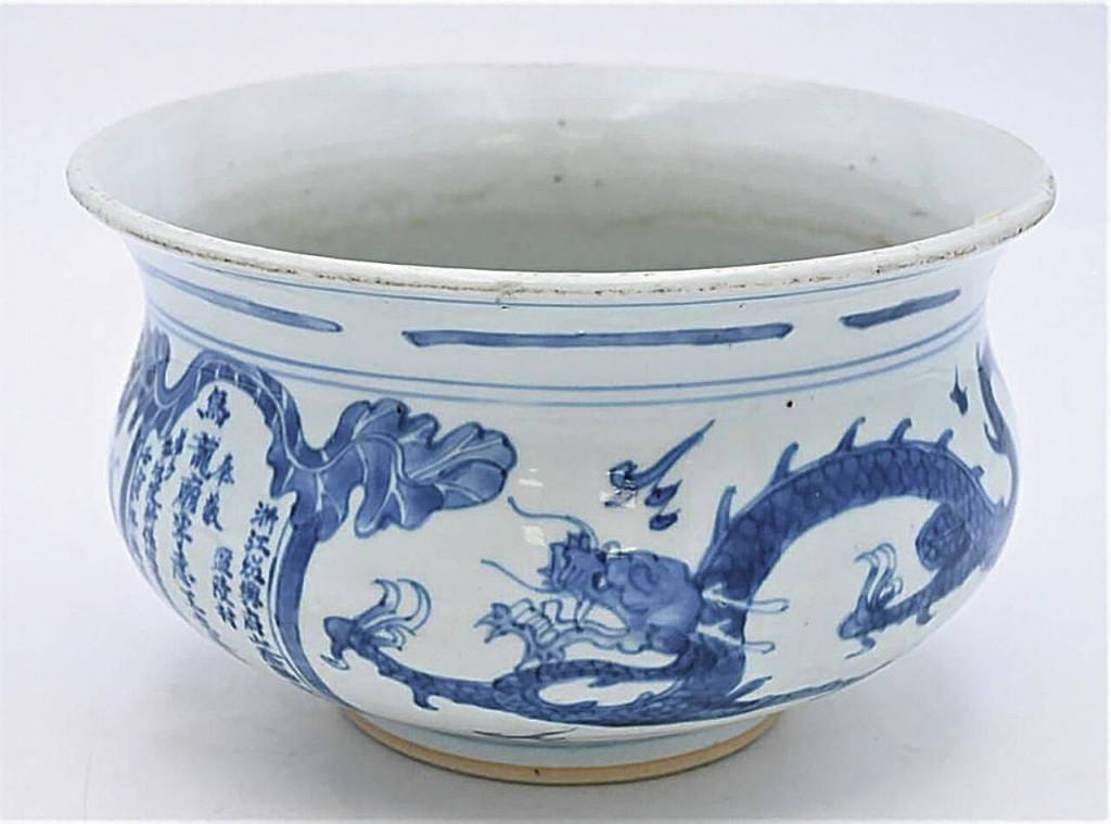 I saw a beautiful antique Chinese porcelain bowl at an auction. It was blue and white with painted dragons, and it had an unusual shape — rounded with a flared rim. The description called it a “zhadou,” but did not say what that meant.