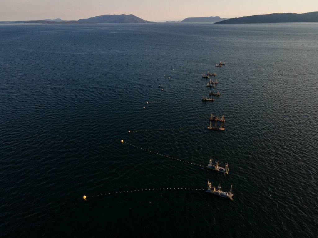 Reefnet fishing is an ancient practice that dates back to the original Indigenous inhabitants of the Pacific Northwest. The technique relies on a net suspended between two stationary platforms, upon which are situated tall spotting towers. When someone standing atop a tower spies a group of salmon, they alert their crew and the net is hauled to the surface.