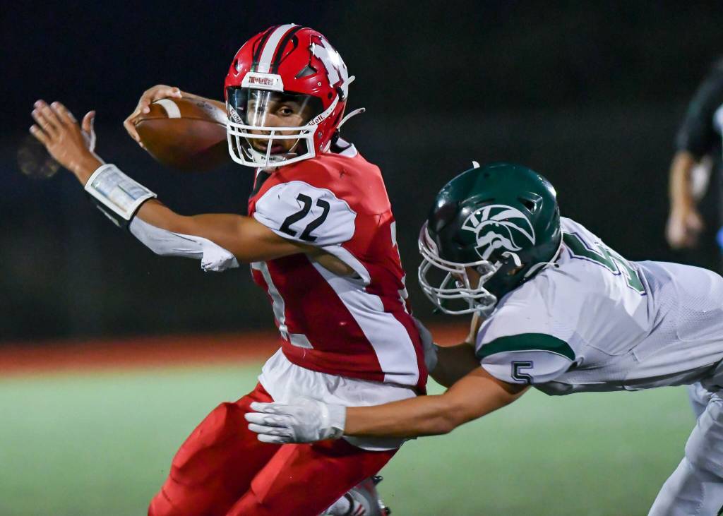 Isaiah Cuellar completed 6-of-12 passes for 188 yards and a touchdown, added 22 yards and a touchdown on the ground and returned an interception for a touchdown for Mariner. Kareem Sy had two sacks for the Marauders’ defense.