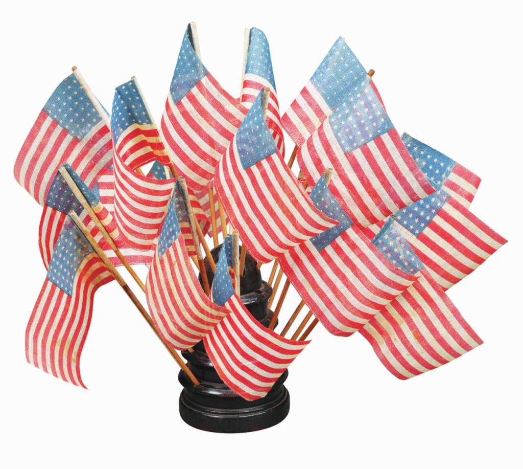 This turned wood flag holder, filled with 20 miniature cloth flags on wooden sticks, is ready for a celebration. It was originally a store display and recently sold for $540 at an AntiqueAdvertising.com auction.