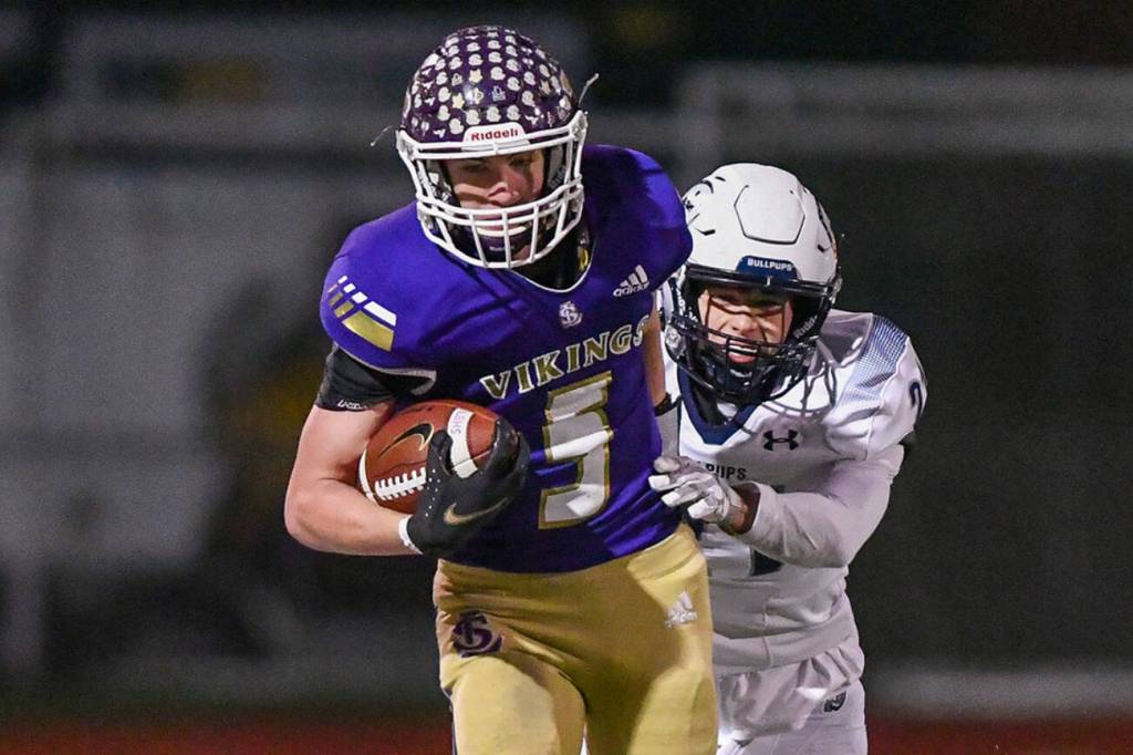 Lake Stevens tight end Cole Becker tip-toes down the sideline after a catch during a Class 4A state quarterfinal game against Gonzaga Prep on Nov. 20, 2021, at Lake Stevens High School. The Vikings take on 3A powerhouse Bellevue on Friday. (John Gardner / Pro Action Image)