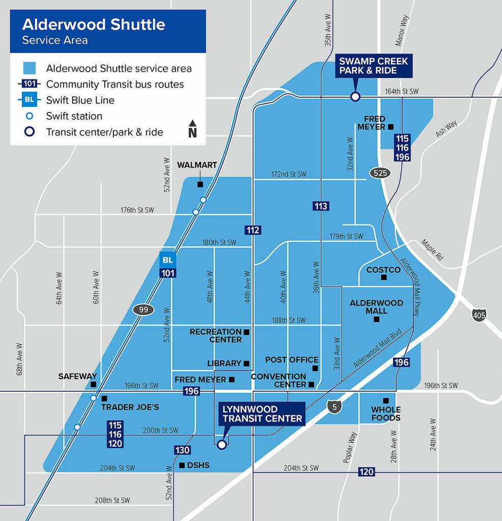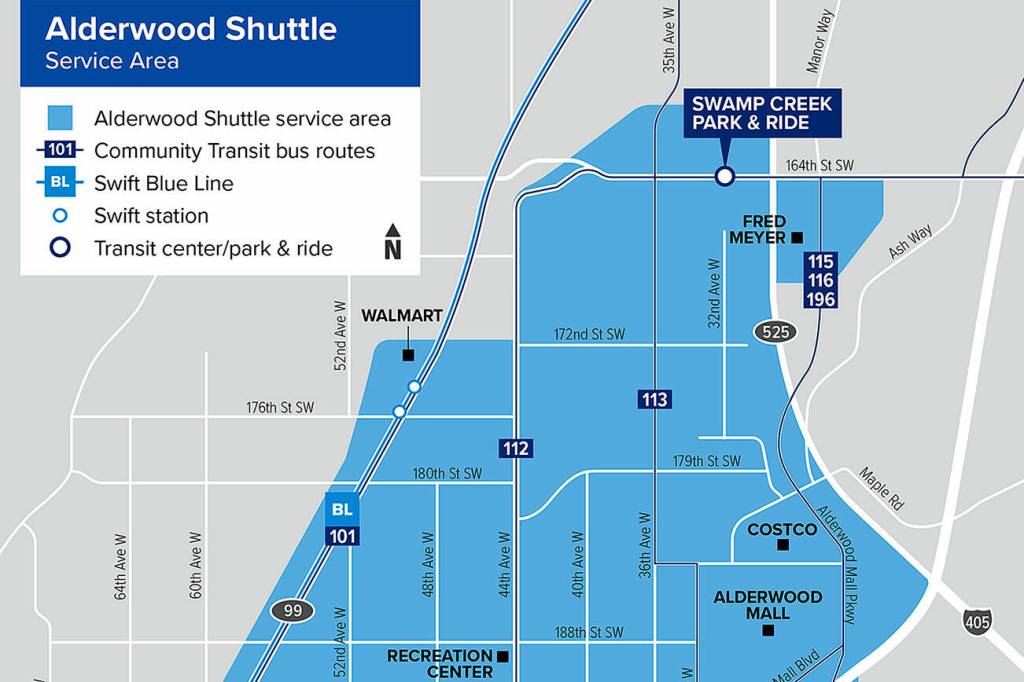 Its schedule is 5 a.m. to 10 p.m. every day. But it won’t have scheduled stops, which means wait times depend on use. Passengers could see waits between 10 and 15 minutes, according to Community Transit. At least two shuttles will run, with four if necessary.