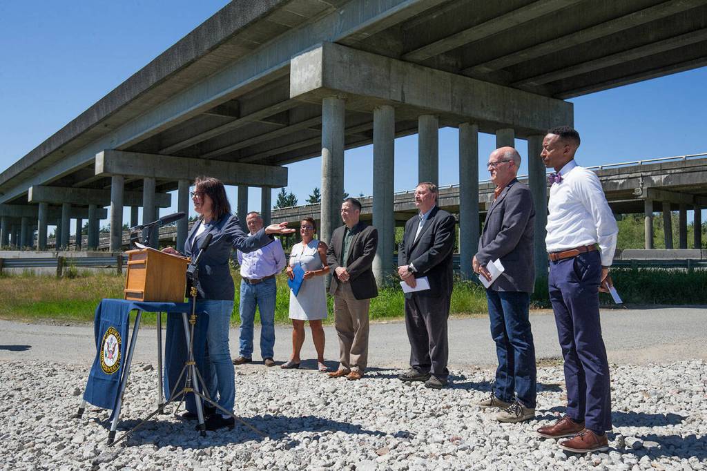 With other officials behind her, U.S. Rep. Suzan DelBene, D-1st District, speaks at a press conference below the U.S. 2 trestle on June 2, 2021 in Lake Stevens. The elected officials gathered to make their case for how an injection of federal funds into the nation’s transportation infrastructure could lead to less congested and safer commutes for Snohomish County residents. (Andy Bronson / Herald file photo)