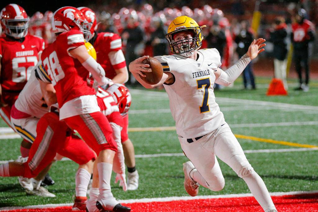 “You saw it on both sides of the ball,” Ferndale coach Jamie Plenkovich said of the stellar performance by his linemen. “(Stanwood’s) been super dynamic on offense all year. So for us to hold them to seven points and really control the line of scrimmage, I think on both sides of the ball, that’s what wins games. Our guys up front lead the way and they did a great job tonight. … Super proud of how our guys played.”