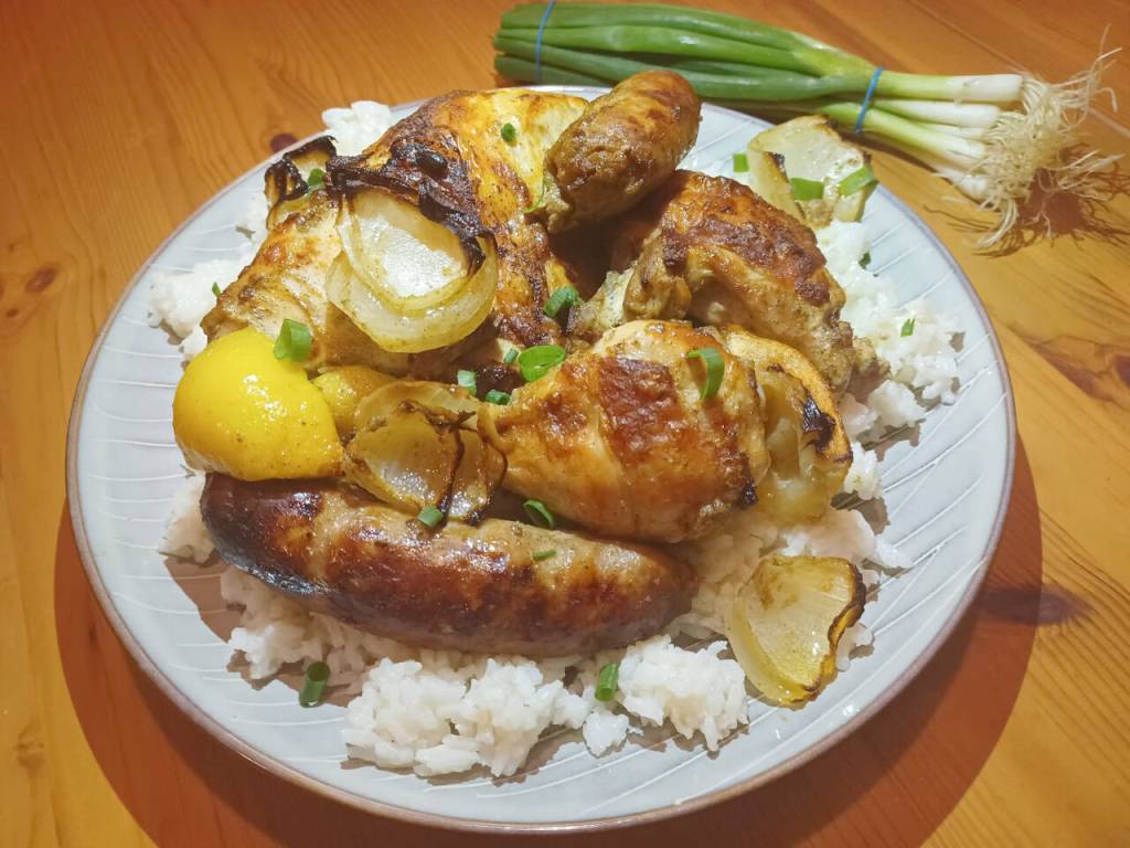Regarding the ingredients, I’ve been known to cheat juuuuust a little, using whatever mustard’s in the fridge — deli to Dijon. I generally use fewer sausages, as well (6-8) and cut a couple in half to let the flavors combine during the cook. Regardless of tweaks, this dish is always a crowd pleaser and you can find it here: nigella.com/recipes/one-pan-sage-and-onion-chicken-and-sausage.