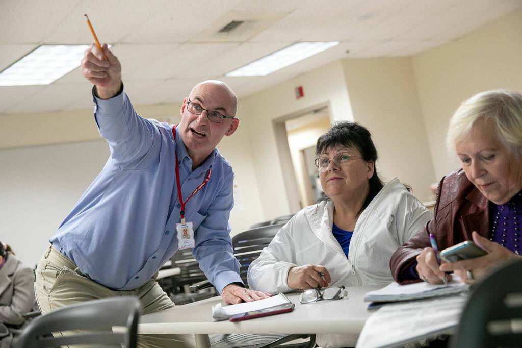 Her Beginner’s English class of 28 students is three students over capacity. Since Russia’s invasion of Ukraine uprooted millions of people, demand has boomed for English classes. This is one of 15 offered at Everett Community College — free of charge.