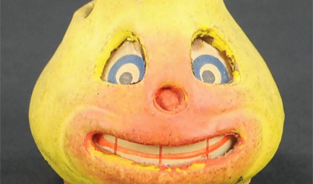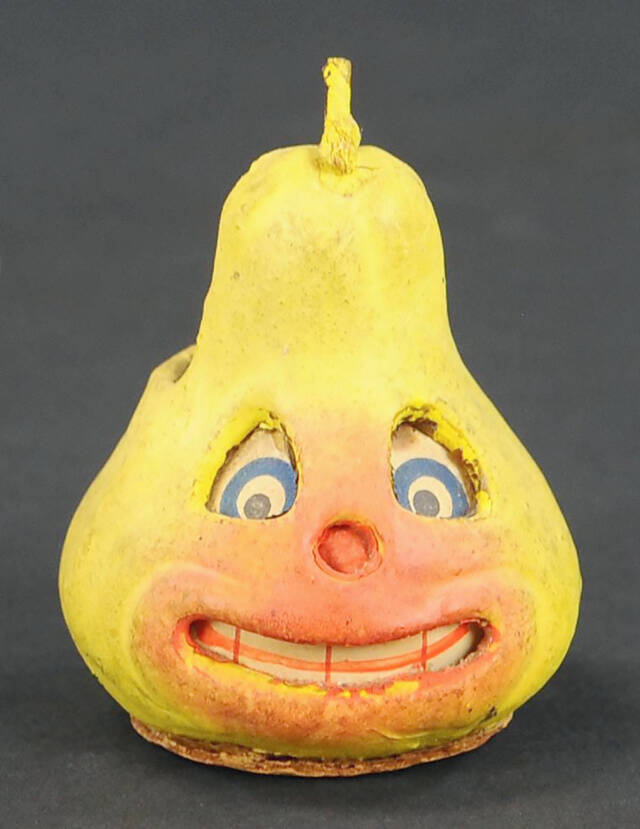Halloween lanterns constructed from papier-mache and pulp experienced their popularity during the 1930s to the 1950s in the U.S. Pumpkin- or gourd-shaped lanterns, along with cats, witches and devils, were much more common than pears, which makes this lantern a rare find. Textures and designs were made more pronounced using papier-mache pulp. The eyes and teeth viewed through the cutout openings are on a separate piece of paper slipped inside the lantern. Used as lanterns with burning candles inside, they are highly flammable, adding to the rarity of this lantern’s existence.