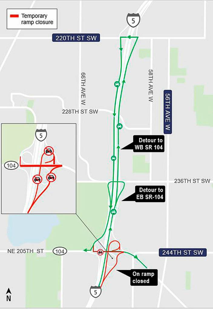 The ramps from both directions of I-5 to Highway 104 are set to close overnight starting at 10 p.m. Monday. Crews will reopen them by 7 a.m. each morning through Nov. 11.