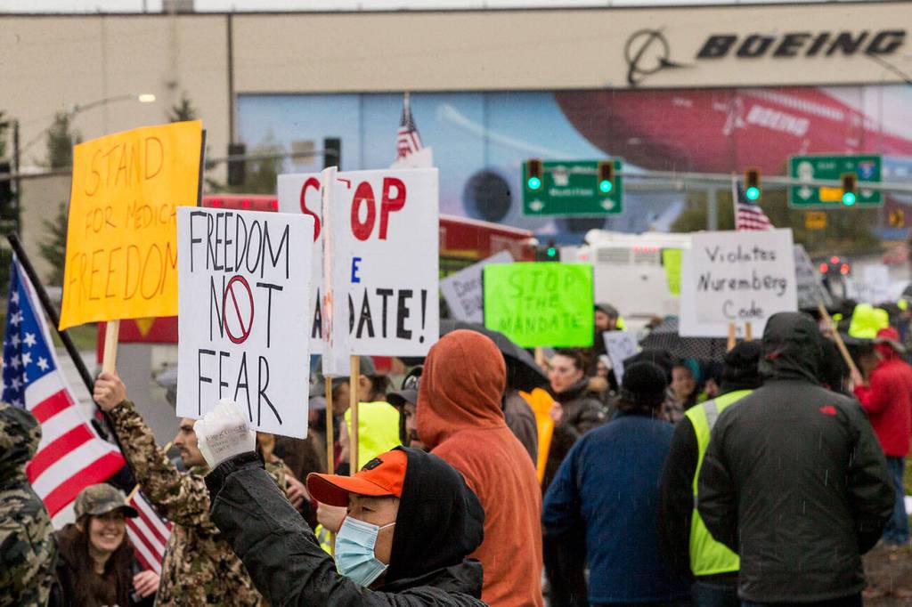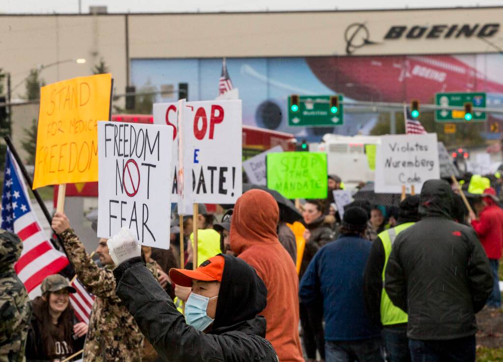 People hold signs in protest of the vaccine mandate after Boeing announced it would terminate workers who do not comply on Friday, Oct. 15, 2021 in Everett, Wa. (Olivia Vanni / The Herald)
