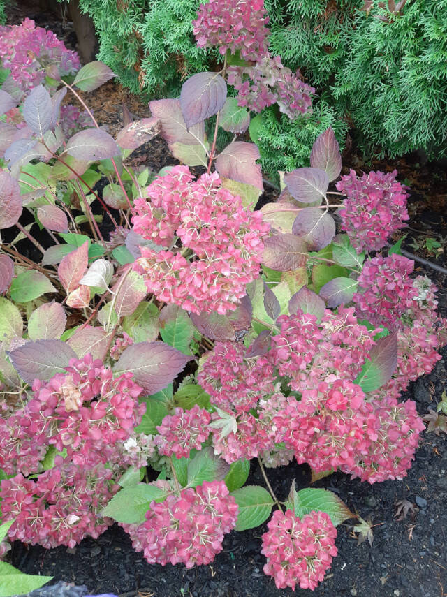 Hydrangeas are unique in that not only do their leaves develop a nice fall color, but the flowers do as well. Instead of fading away like most blossoms, those of both the shade-loving big leaf varieties and the sun-loving panicle types retain their blooms throughout the summer and as the fall arrives they turn dark red. That, in my book, is a total bonus that you will never see in a broadleaf evergreen, like a rhododendron.