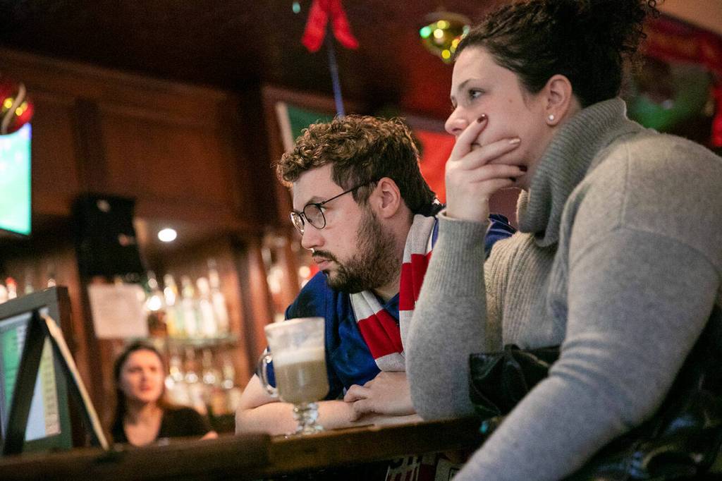 About 20 fans gathered at the Irishmen, collectively whooping and sighing amid the game’s ups and downs. They sipped on Irish coffee drinks and pints of Guinness.