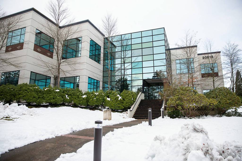 Snow lingered outside the office building of Receivables Performance Management on Thursday, Dec. 1, 2022, in Lynnwood, Washington. (Olivia Vanni / The Herald)