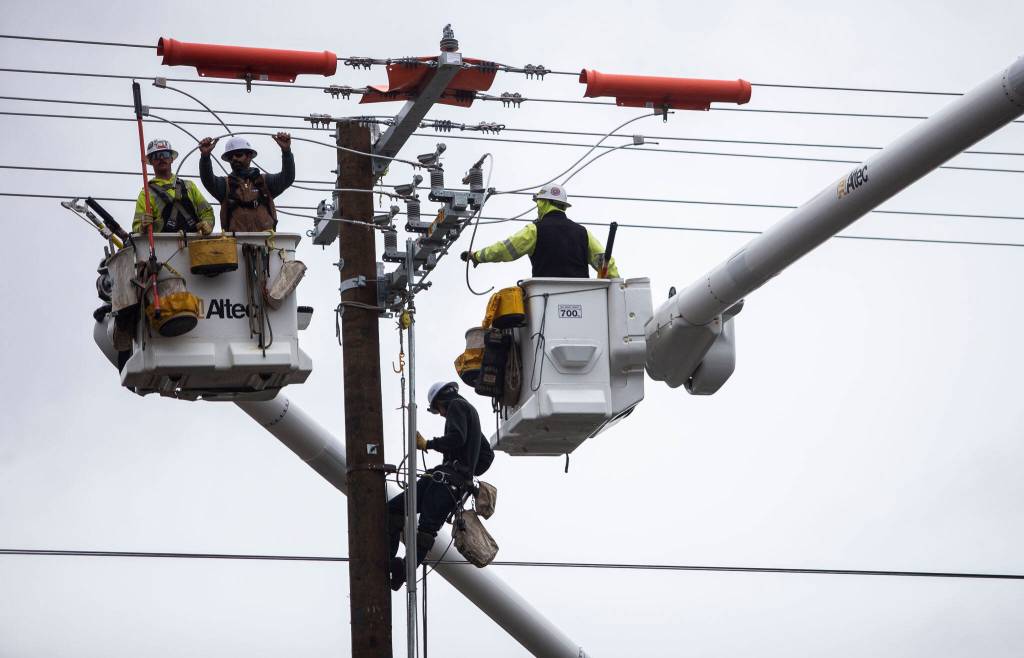 Snohomish County PUD workers install new transformers along 132nd Street on Oct. 25 in Mill Creek. (Olivia Vanni / The Herald)
