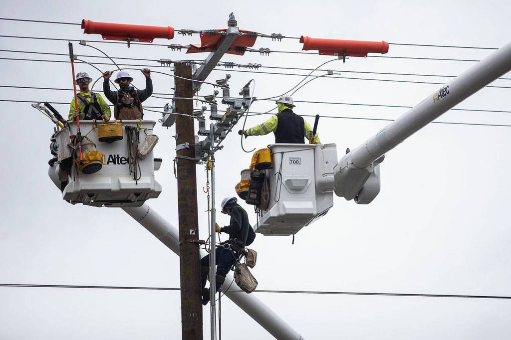 Snohomish County PUD workers install new transformers along 132nd Street Oct. 25 in Mill Creek. (Olivia Vanni / The Herald)