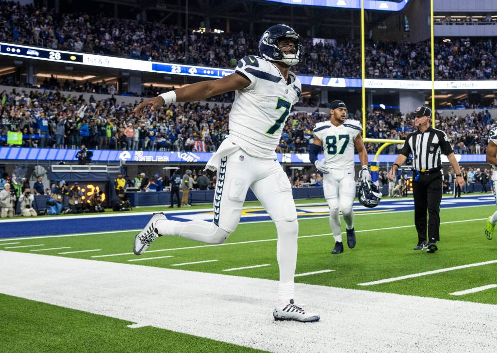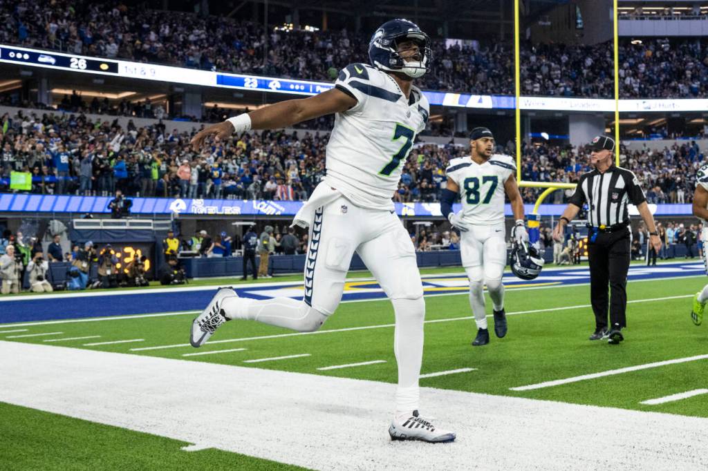 Seahawks quarterback Geno Smith reacts after a touchdown during a game against the Rams this past Sunday in Inglewood, Calif. (AP Photo/Kyusung Gong)