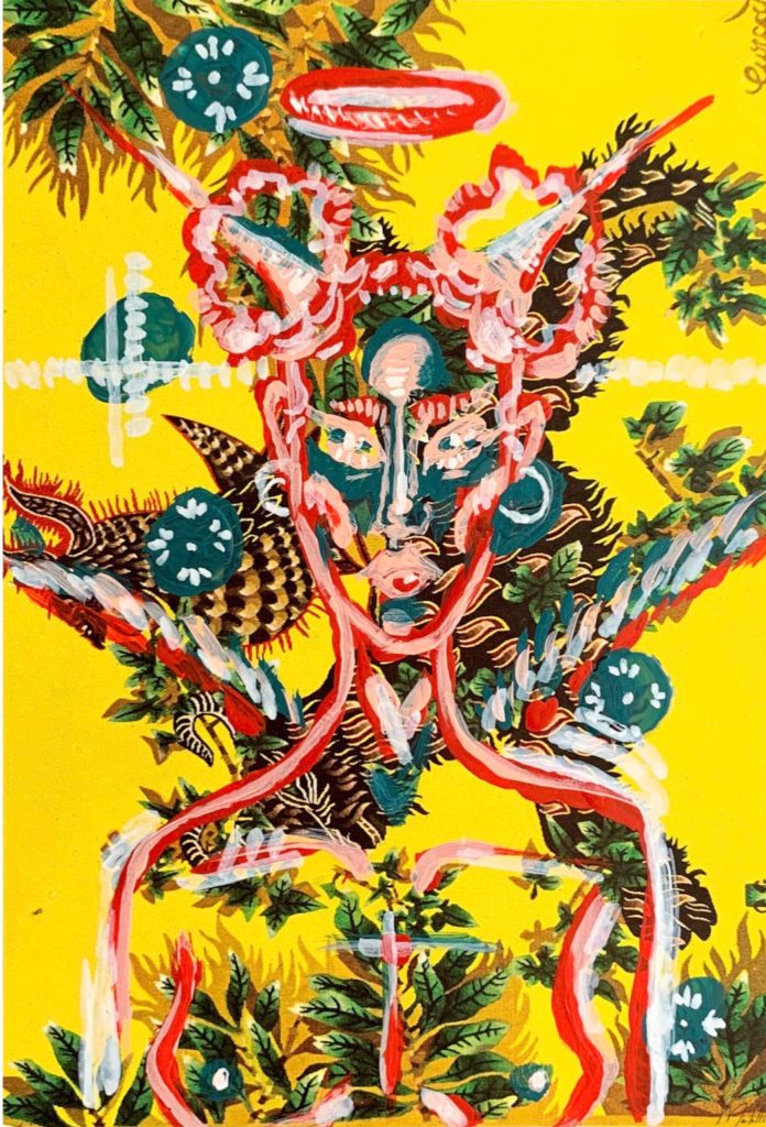 She is known for “FEMME,” her acrylic painting on a vintage postcard that was on display at her “Love Games in a Flowering Garden” show at Lucky Dime.