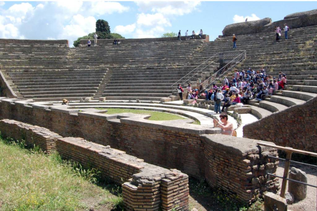 On the main drag you’ll see the vast theater (teatro). One of the oldest brick theaters anywhere, it’s still used for concerts today. The three rows of marble steps near the orchestra used to be for big shots.