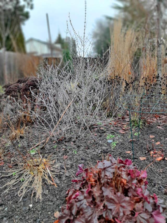 Scattered throughout the garden are small drifts of Black Mondo Grass, which contrast nicely with the low-growing felty leaves of Lamb’s Ears. I planted a variety called ‘Primrose Heron’, which, in the spring will put out new growth with a primrose yellow hue that eventually fades to silver. Even the Russian Sage, long since out of bloom and with barely a leaf left, reveals its upright silvery stems in great prominence.