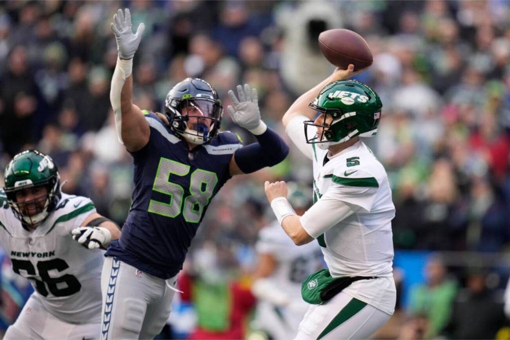New York Jets quarterback Mike White throws under pressure from Seattle Seahawks linebacker Tanner Muse during a game Jan. 1 in Seattle. (AP Photo/Godofredo A. Vásquez)