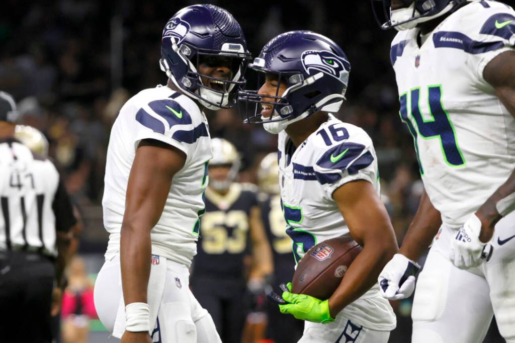 Seattle Seahawks quarterback Geno Smith, left, celebrates his touchdown pass to wide receiver Tyler Lockett during a game against the New Orleans Saints in New Orleans on Oct. 9, 2022. (AP Photo/Derick Hingle)