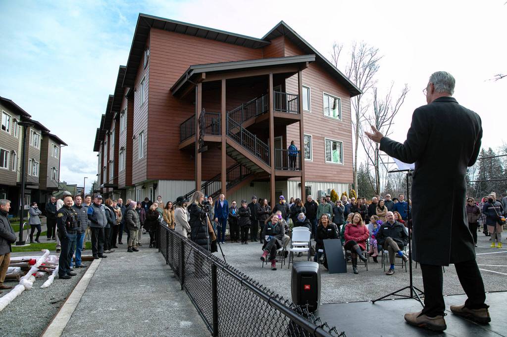 About 100 people gathered on the basketball court and playground at the center of the complex, including U.S. Rep. Suzan DelBene, D-Medina, representatives from the Tulalip Tribes and county and city elected officials. Marysville Mayor Jon Nehring cut the ribbon marking the development, the nonprofit’s fourth in the city, as ready for its new residents.