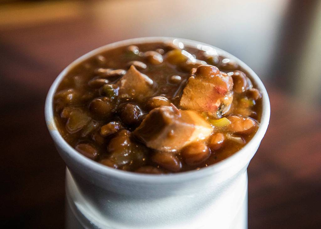 A cup of fresh brisket baked beans from Jeff’s Texas Style BBQ in Marysville. (Olivia Vanni / The Herald)