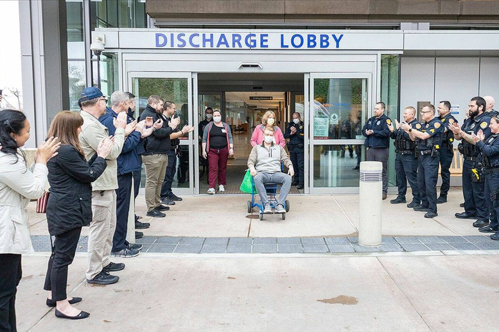 Everett police officers and civilian employees greet officer Chad House on Thursday, March 23, 2023, as he’s wheeled out of Providence Regional Medical Center Everett. (Everett Police Department)