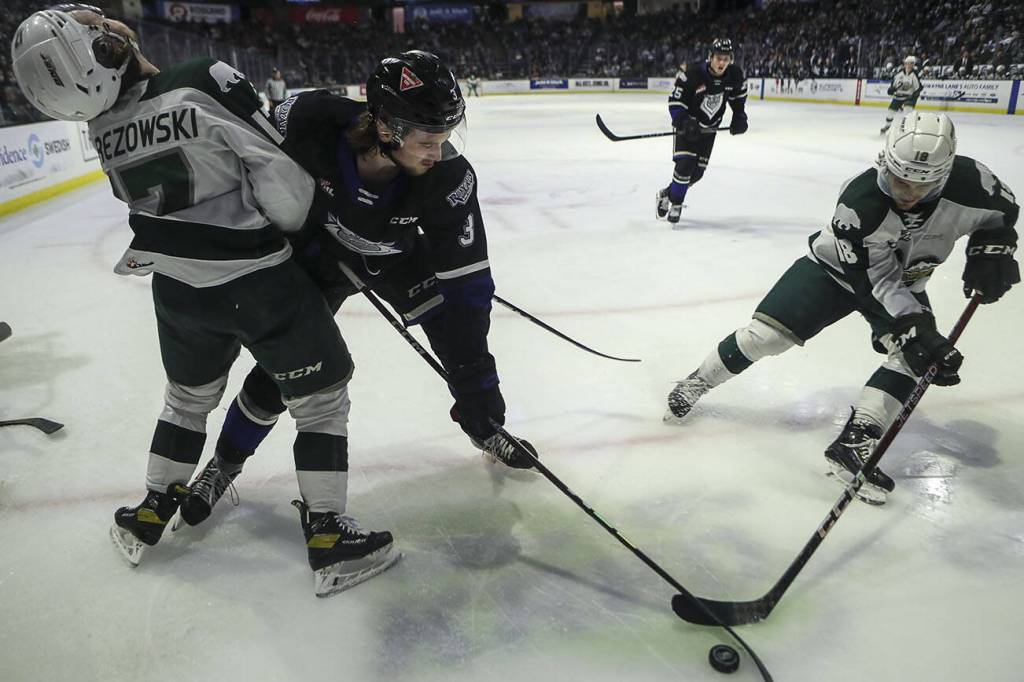 Everett found itself behind 2-0 before some members of the crowd had even settled into their seats. Victoria opened the scoring just 1:05 into the contest when Nate Misskey’s shot from the right point found its way through bodies and under Everett goaltender Tyler Palmer. Then just another 1:05 later the Royals scored again, Teydon Trembecky getting the better of a defender at the blue line to skate in free on goal, then firing into the top corner.