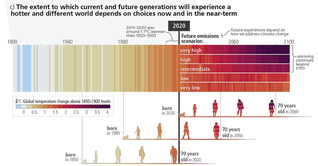 The revision that’s stuck in my head is the illustration with human silhouettes at the bottom of the graphic, courtesy of IPCC graphic officer Arlene Birt: It shows the lifespans of people born in 1950, 1980 and 2020 color-coded to their chronological place in the warming of the planet. Each generation has a completely different relationship to the Earth’s crisis.