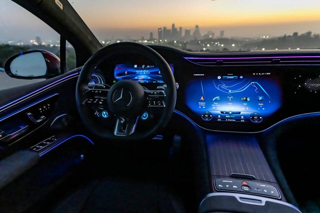 The MBUX Hyperscreen inside the Mercedes-AMG EQS sedan puts on a show. (Mercedes-Benz)