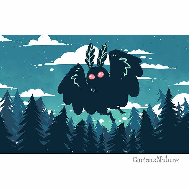 To accomplish her mission, Hadsall uses a mix of rich pinks and calming blues in her digital depictions of frightening beasts such as the Mothman. According to legend, that flying humanoid creature with glowing red eyes was first spotted in West Virginia in 1966. And, as legend has it, disasters occur shortly following sightings of the creature.