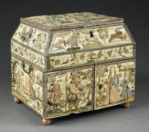 All forms of embroidery, including stumpwork, were popular in England throughout the 1600s. Richly embroidered textiles and the items made from them grew more popular as more people could afford them. Many surviving examples of embroidery, including some museum-quality pieces, were made by amateurs, probably girls or young women. Girls would learn embroidery at a young age and practice their stitches with samplers, another popular collectible. Elaborately embroidered boxes like these may have been projects for girls learning embroidery to show their mastery of the skill. However, no matter how skilled women were at embroidery, they were not likely to become professionals. Only men could join professional embroiderers’ guilds.