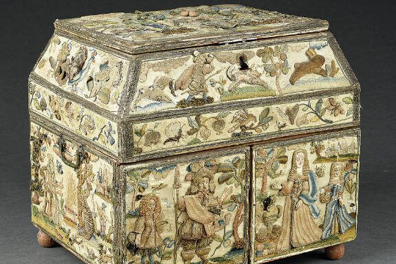 This needlepoint casket was made about 1660 in England and sold for $17,920, nearly three times its low estimate, at Morphy Auctions. A closer look shows that the colorful people, plants and animals stitched onto the fabric are three-dimensional, making the stitching even more complex. This tricky technique, called stumpwork, required padding the stitches to make the designs stand out. Scenes of people and animals in nature settings, often with allegorical meanings or Biblical references, were among the favorite subjects.