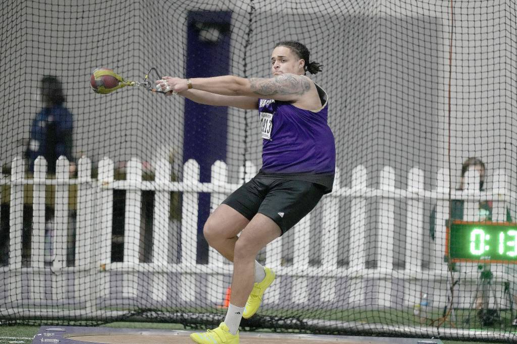 Washington's Jayden White, an Everett High School alum, broke his own school record in the weight throw at the Husky Classic on  Feb. 12, 2022, in Seattle. (Red Box Pictures)