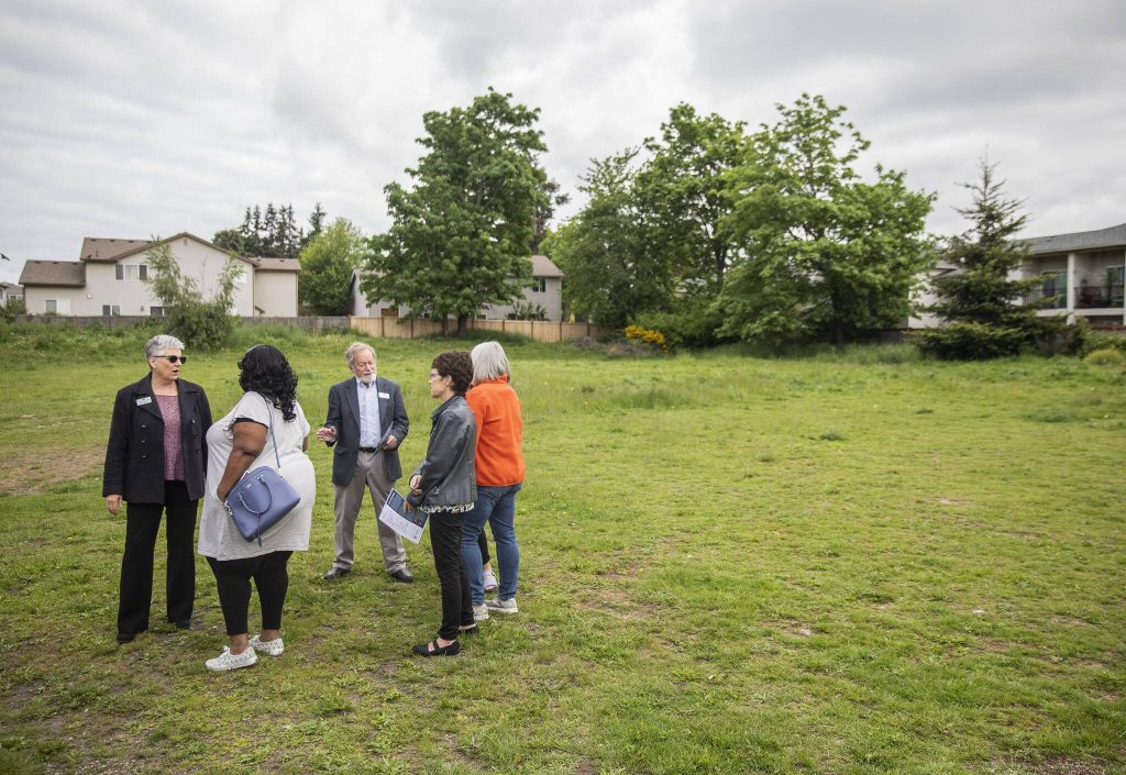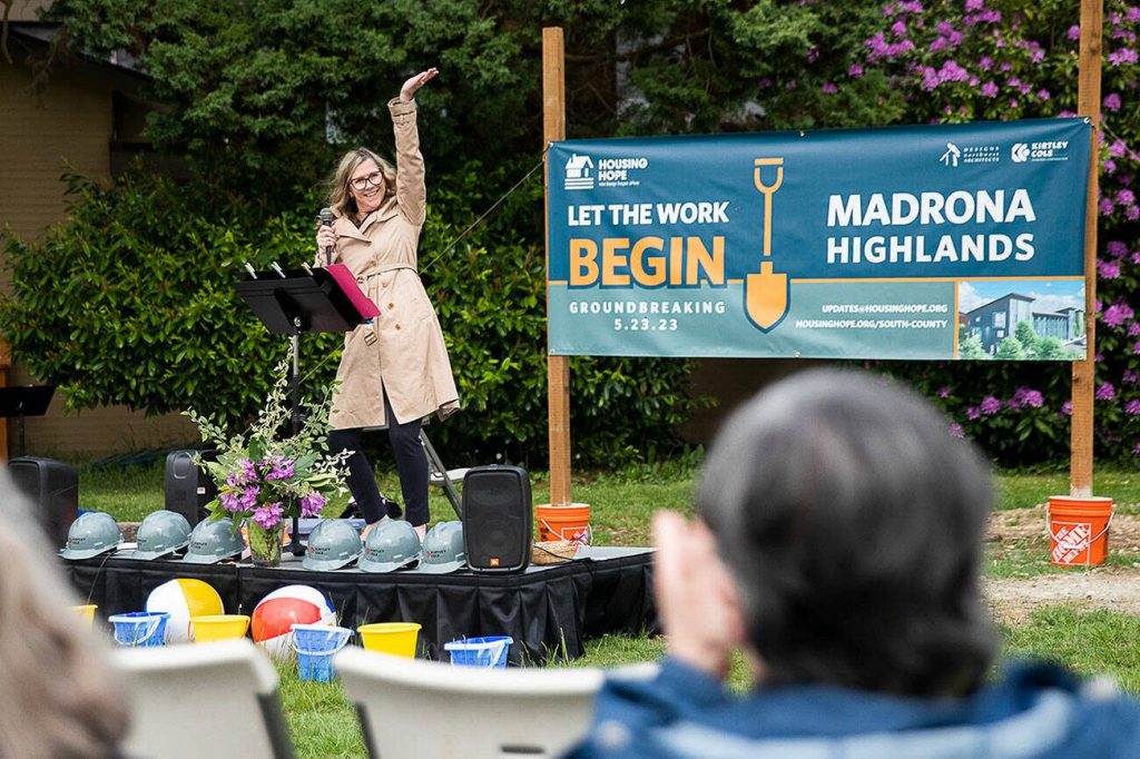 People gather for the ground breaking of the Housing Hope Madrona Highlands project on Tuesday, May 23, 2023 in Edmonds, Washington. (Olivia Vanni / The Herald)