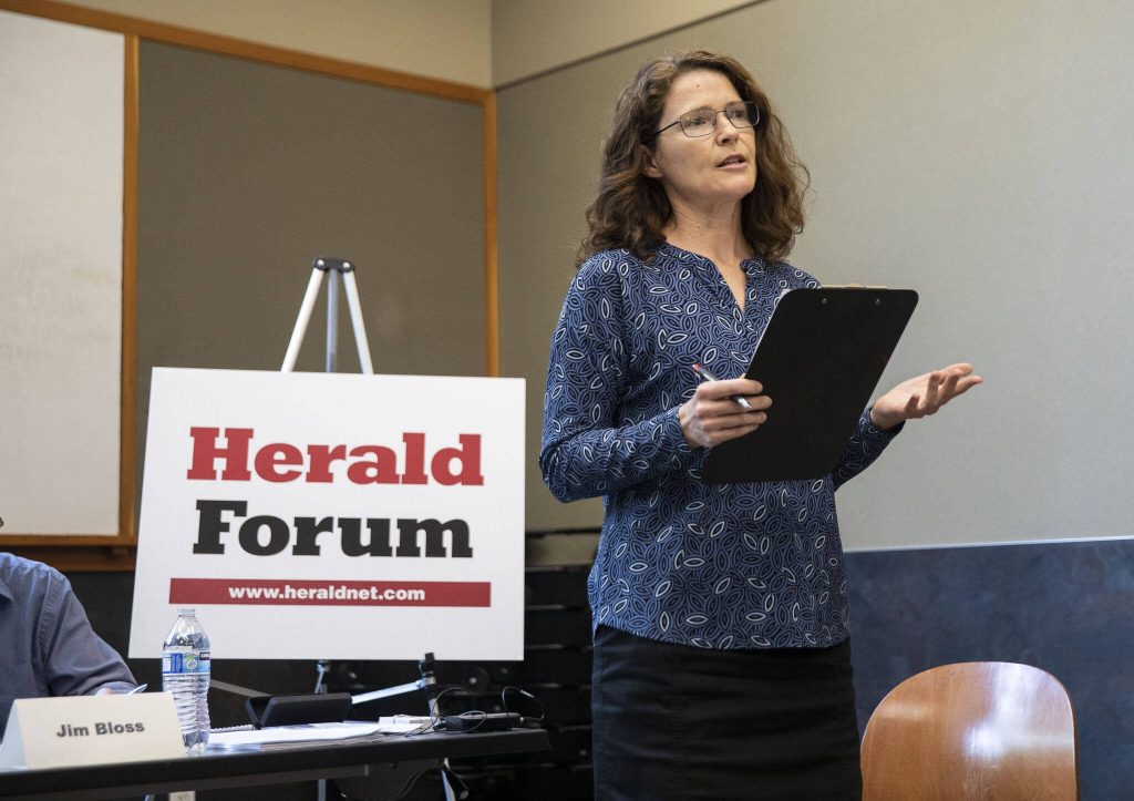 Everett Herald journalist Joy Borkholder leads the panel in discussion on Wednesday, May 31, 2023 in Snohomish, Washington. (Olivia Vanni / The Herald)