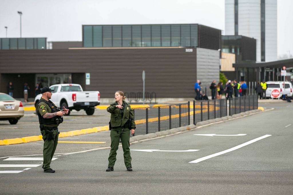 Two members of the Snohomish County Sheriff’s office direct traffic as TSA and other airport workers gather outside the terminal at Paine Field after the discovery of a suspicious package at the airport on Tuesday, June 13, 2023, in Everett, Washington. (Ryan Berry / The Herald)