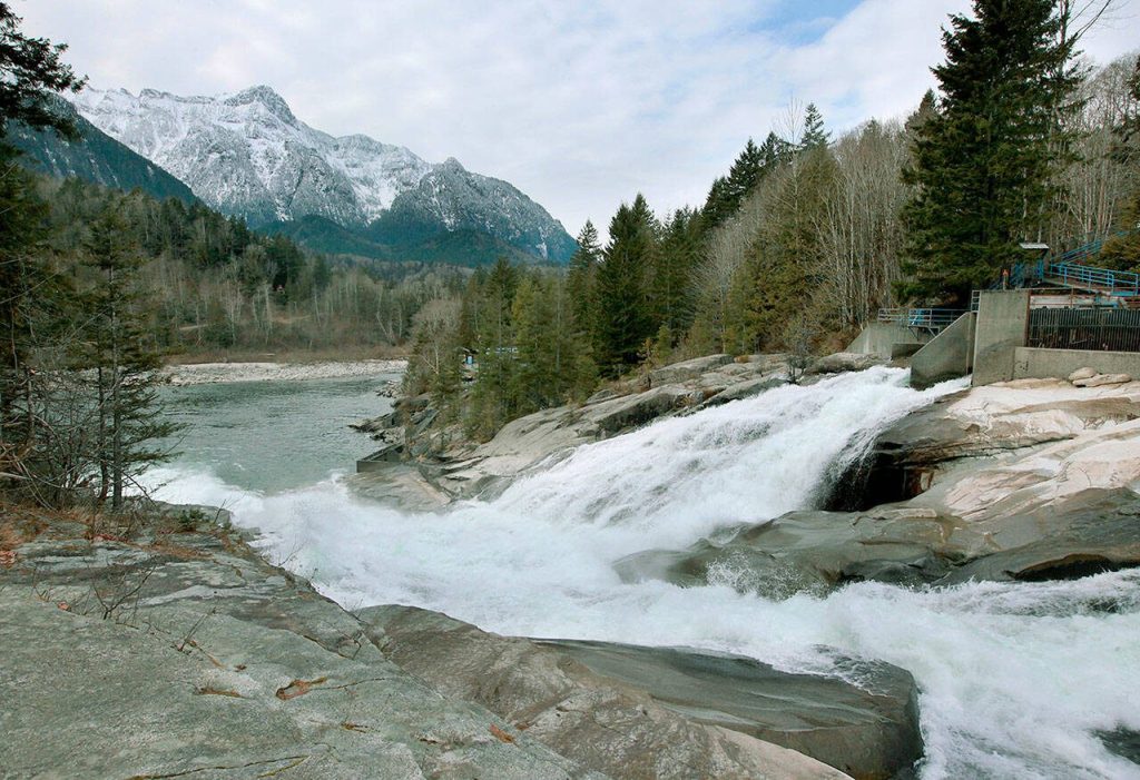 Sunset Falls is the largest of three waterfalls on the South Fork Skykomish River, according to the Northwest Waterfall Survey. The waterfall drops 104 feet into the river. The falls are not open to public access, but campgrounds and vacations spots are available near the site.