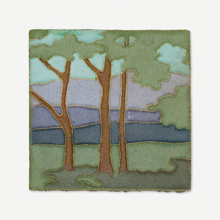 This tile, which sold for $2,125 at a Rago auction, shows another side of the pottery. The subject matter of a few trees in a landscape may have been influenced by Artus’ training as a painter in Europe before his career in ceramics. The shapes in the background may have been inspired by the mountain scenery of Colorado.