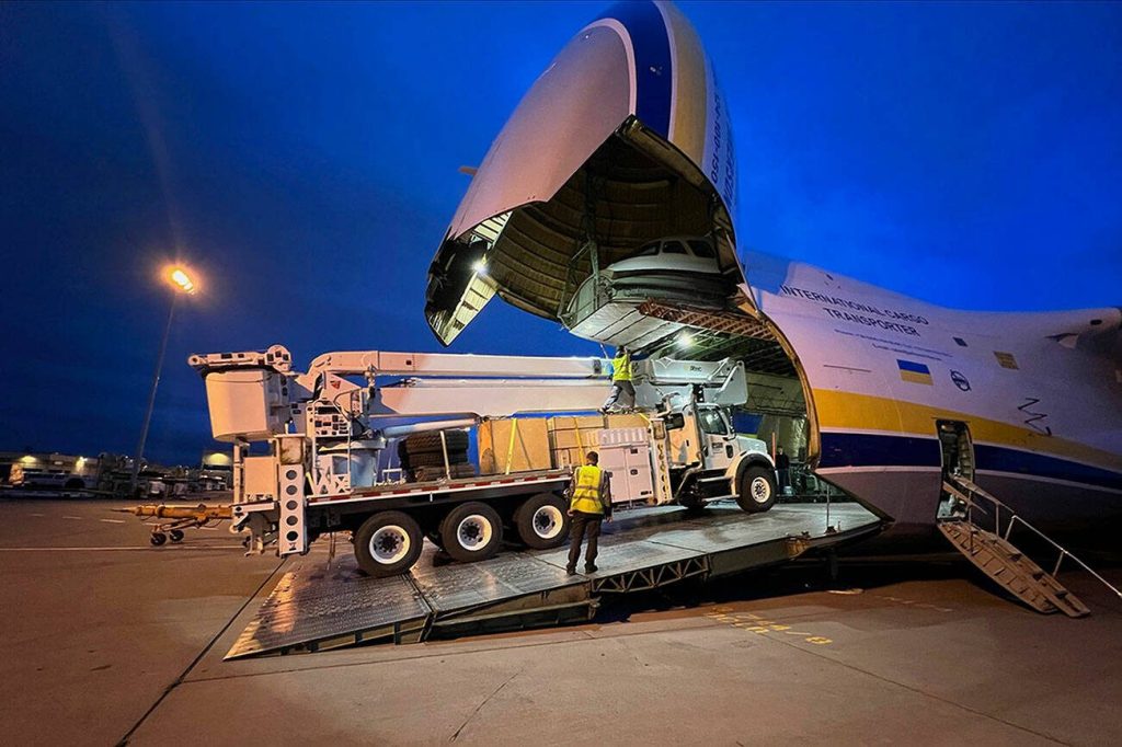A 125-foot bucket truck weighing 30 tons, a 105-foot bucket truck and a 20-ton mechanics truck were stowed aboard an Antonov AN-124, a massive cargo plane, that took off from Seattle-Tacoma International Airport on June 13.