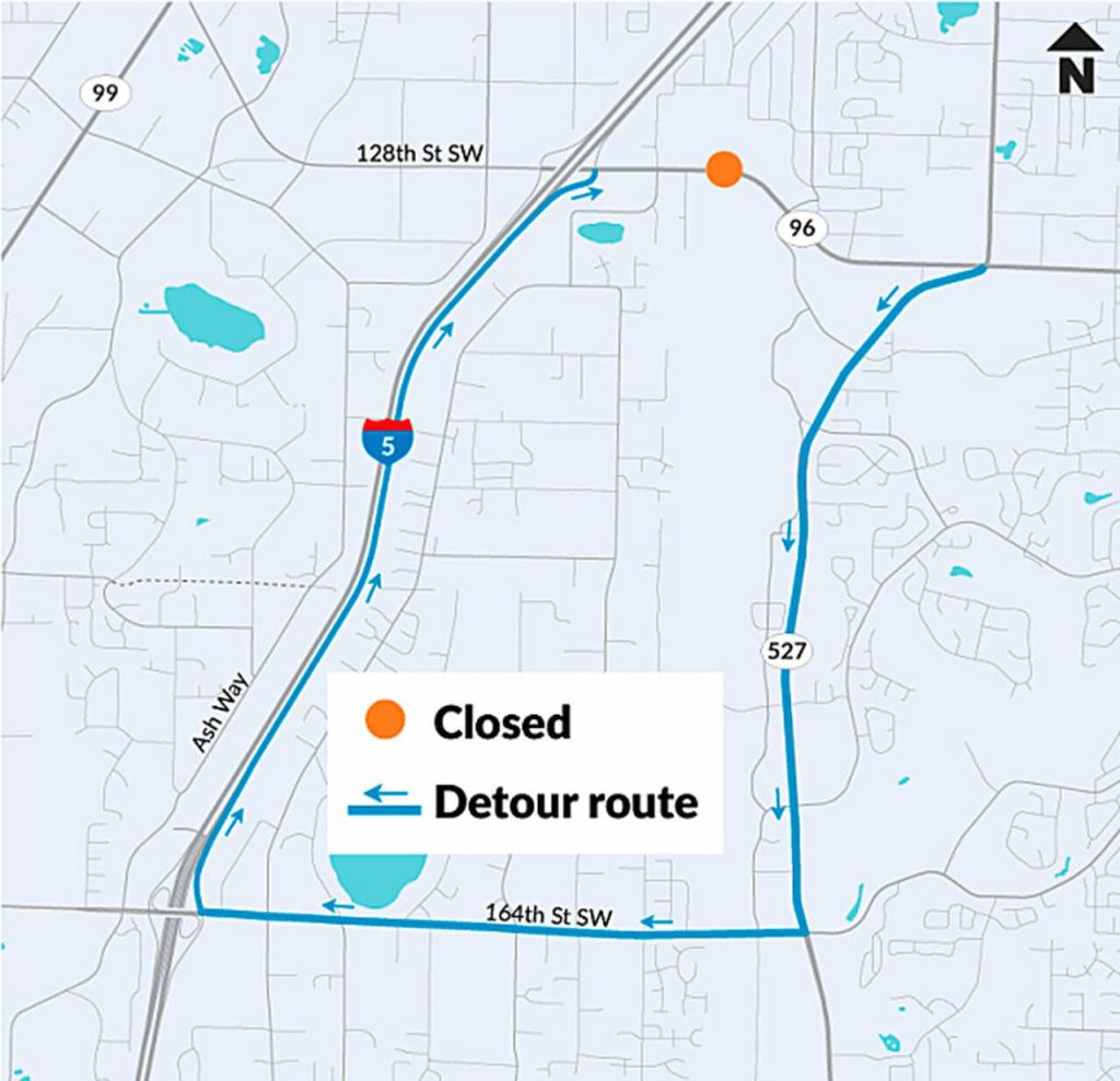 The detour for westbound travel is 6.5 miles around the closure. It takes people to Highway 527, 164th Street SE and northbound I-5 to reach destinations on the other side of the road closure.