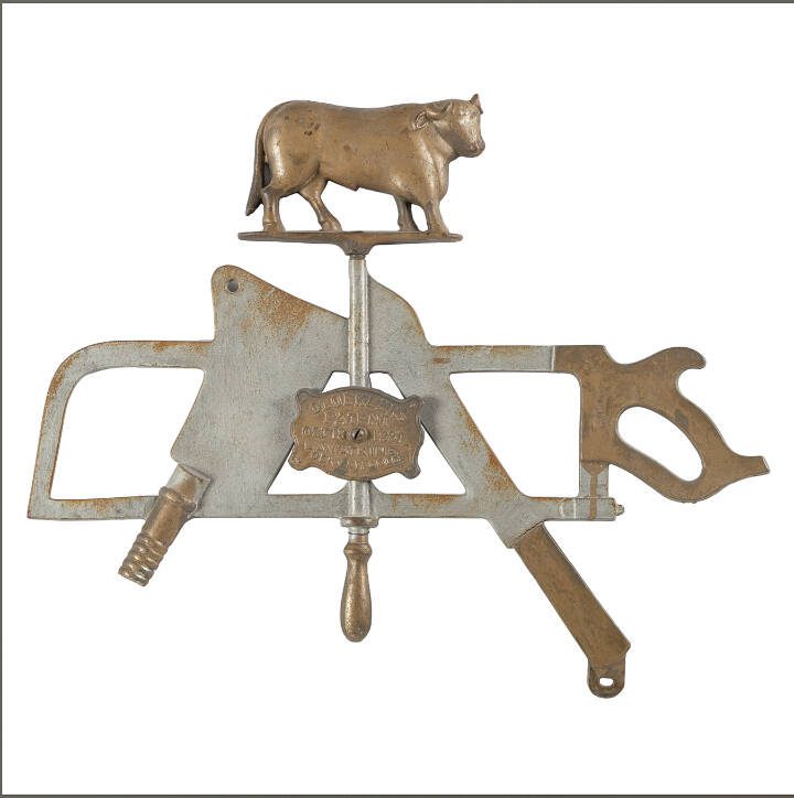 The design seen on this sign, a saw, cleaver and knife with a standing bull for a finial, appears on many other Gloekler pieces. For example, a smaller version may be used as a crest on butcher’s racks. Maybe keep Gloekler in mind at your next barbecue!