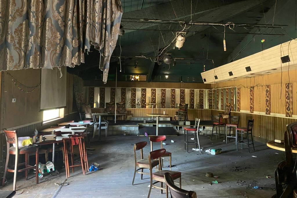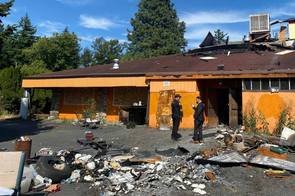 The two-story building sits right off the I-5 exit to Smokey Point Drive. On Wednesday, exterior damage and plywood on the the doors and windows hid most of the orange building’s color. Trash, to-go boxes and rusty cans were strewn about outside. Inside the former bar and grill, a smell of stale soot hung in the air. Old food, cans of mayonnaise and tomato sauce were discarded across the floor. Half-empty bottles of liquor still sat on the open bar.