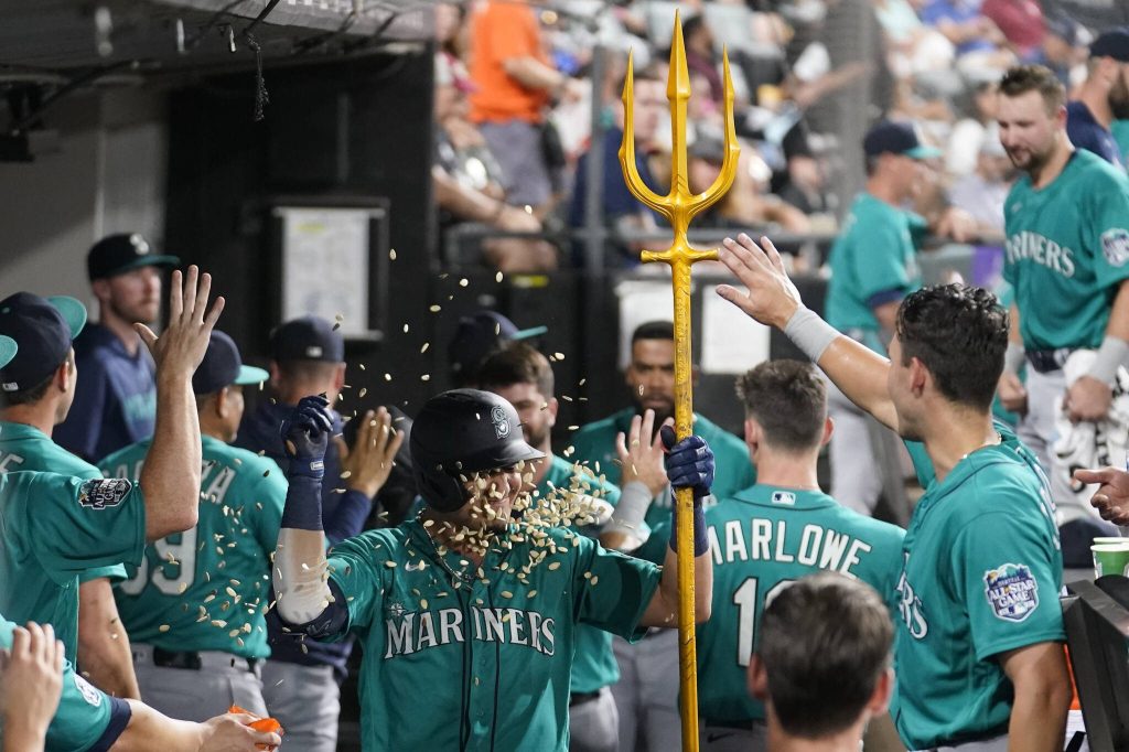 The Mariners’ Josh Rojas is doused with pumpkin seeds in the dugout after his two-run home run off White Sox starting pitcher Mike Clevinger during the fourth inning of a game Tuesday in Chicago. (AP Photo/Charles Rex Arbogast)