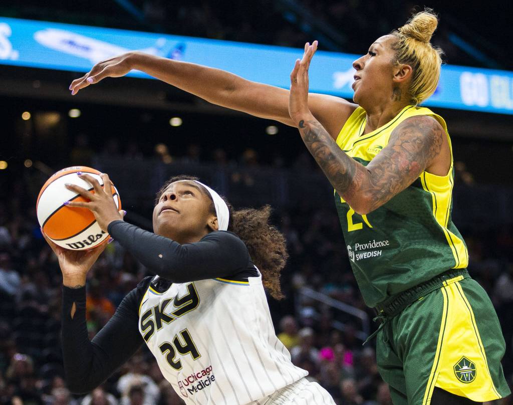 Seattle Storm’s Mercedes Russell reaches out to blocks a shot by Chicago Sky’s Ruthy Hebard during the game at Climate Pledge Arena on Sunday, Aug. 27, 2023 in Seattle, Washington. (Olivia Vanni / The Herald)