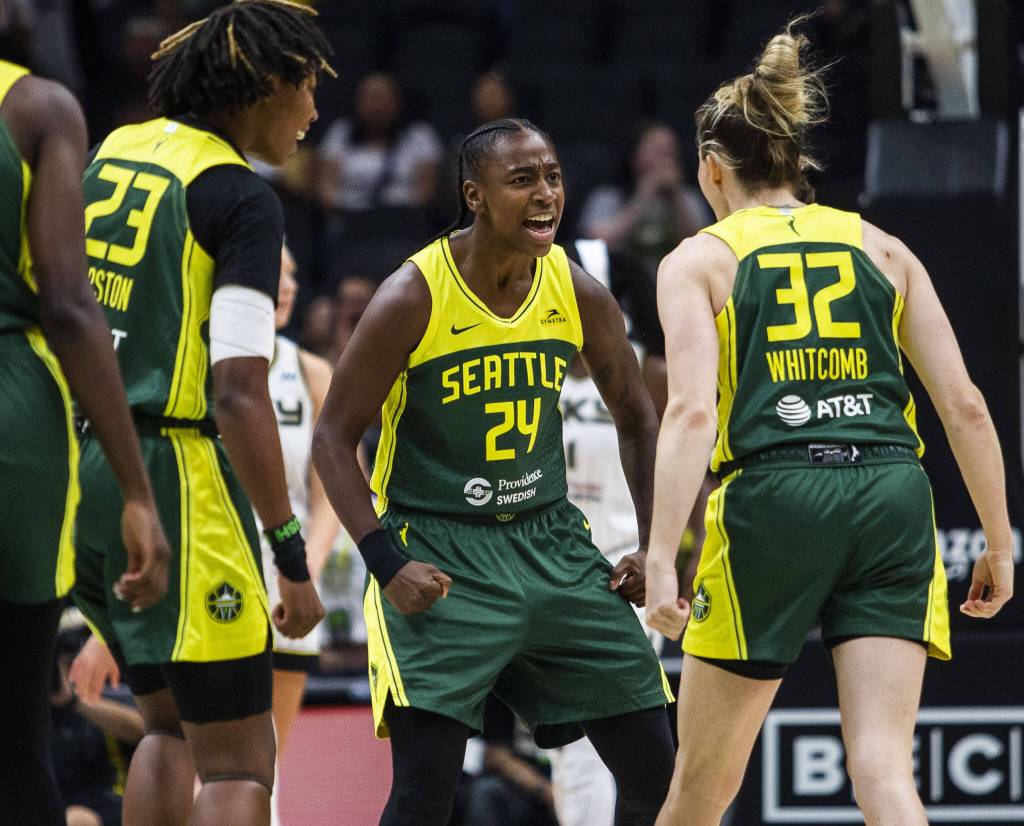 Seattle Storm’s Jewell Loyd celebrates teammate Sami Whitcomb three-point shot during the game against the Chicago Sky at Climate Pledge Arena on Sunday, Aug. 27, 2023 in Seattle, Washington. (Olivia Vanni / The Herald)