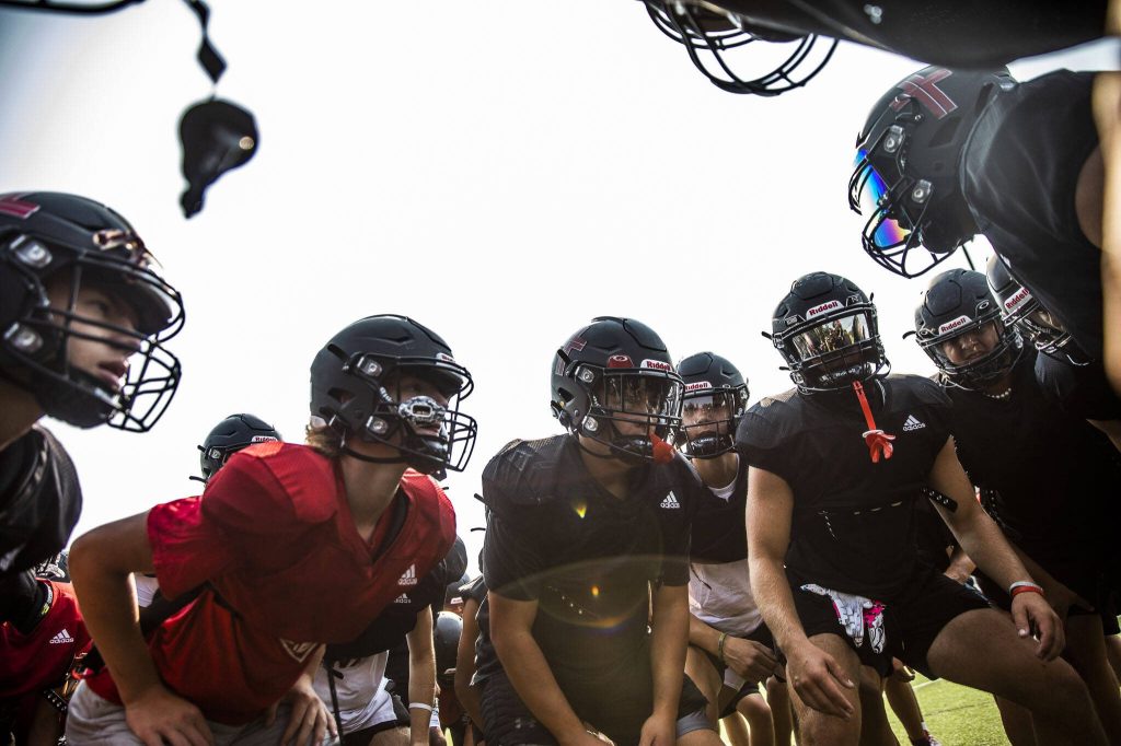 Archbishop Murphy football players gather for a huddle during practice on Thursday, Aug. 24, 2023 in Everett, Washington. (Olivia Vanni / The Herald)
